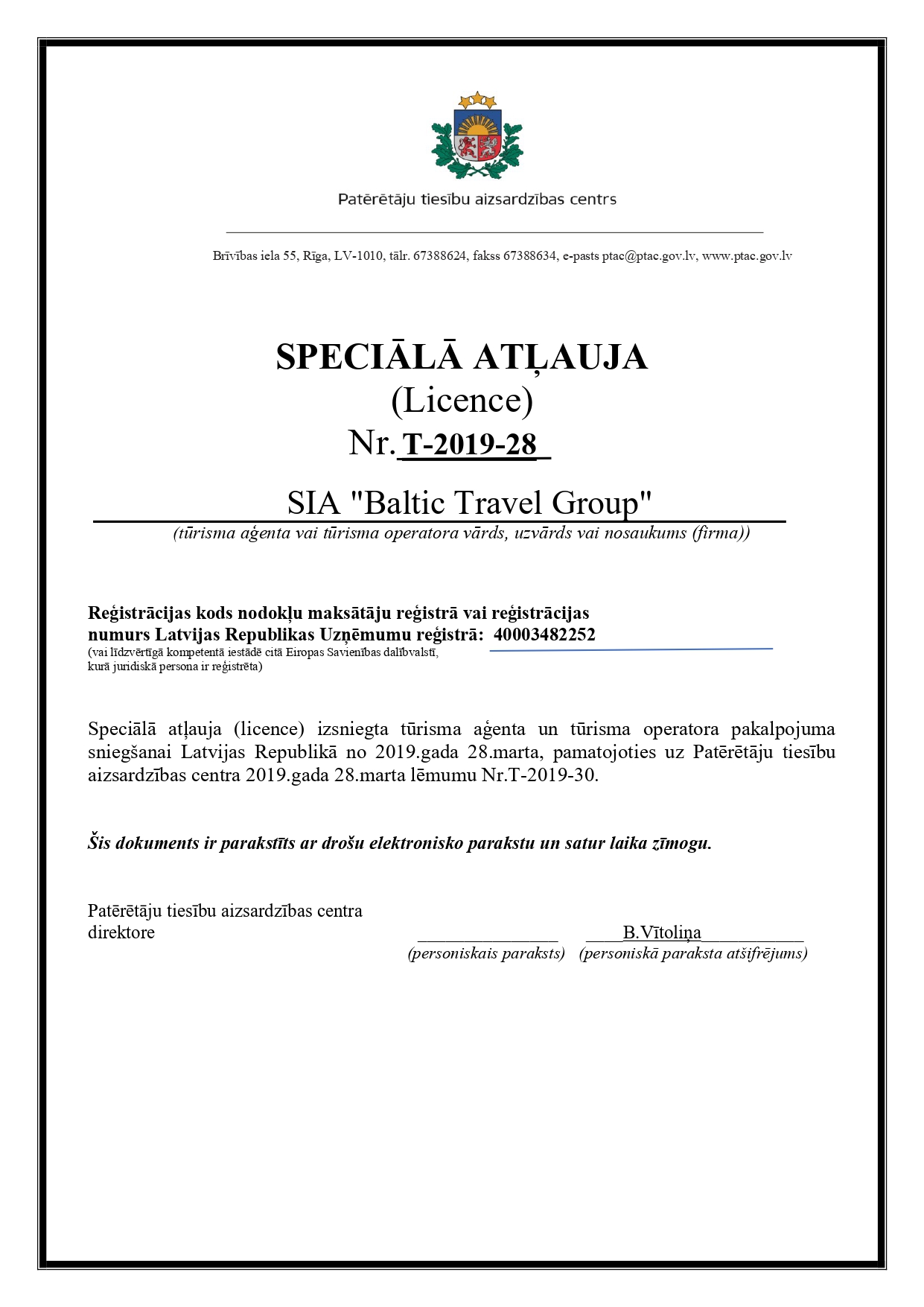 1.1. Personal data processing controller shall be a person, who shall determine purposes for which the personal data shall be processed and the way in which it shall be processed. Personal data processing controller shall be Baltic Travel Group – limited liability company “Baltic Travel Group”, registration No. 40003482252, legal address: Elizabetes Street 31, Riga, LV-1010.