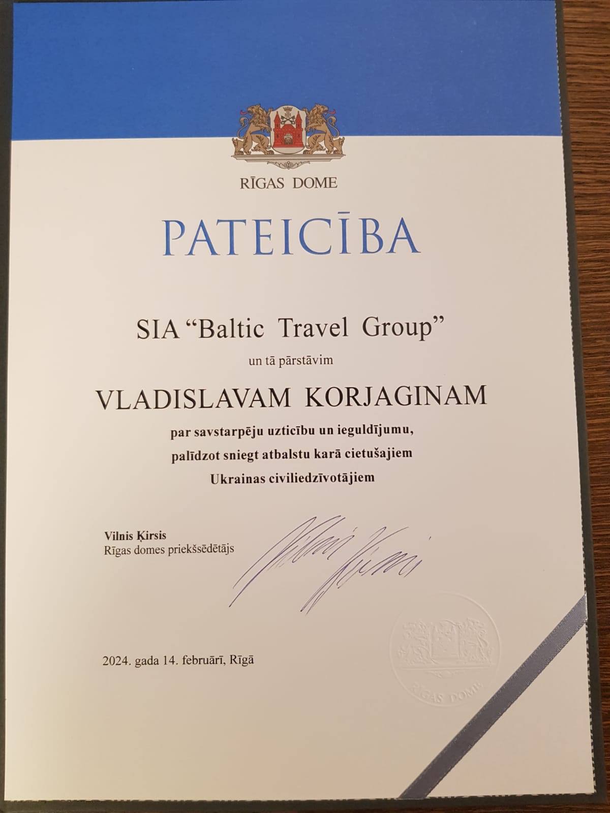 On February 14th, 2024, Riga City Council thanked eight companies, including BTG represented by Vlad Koriagin, for helping Ukrainian refugees at the Riga Support Center feel welcome.